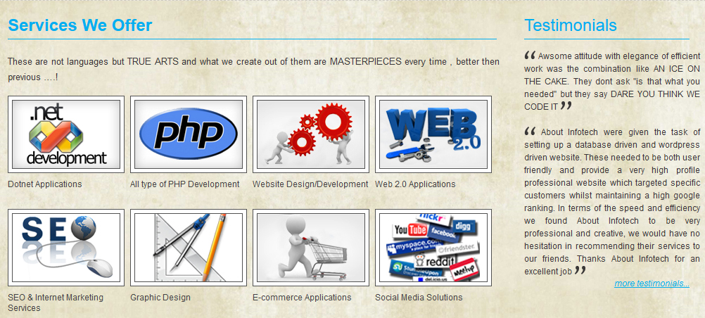 About InfoTech is a Delhi-based professional and well-established web services, internet marketing solutions provider company. The company offers effective, stylish and affordable web development services including SEO, SMO, ORM and PPC to all types of businesses and corporate entities helping them avail an impressive global presence. The company has created a strong reputation and a niche for itself by consistently building websites and promoting websites which are accessible to the widest possible audience. The websites that company creates are easily updatable and meet almost all your business objectives by offering creative and productive solutions on Internet website design.