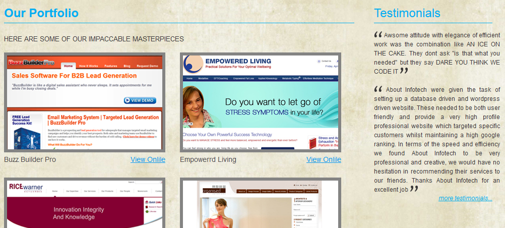 About InfoTech is a Delhi-based professional and well-established web services, internet marketing solutions provider company. The company offers effective, stylish and affordable web development services including SEO, SMO, ORM and PPC to all types of businesses and corporate entities helping them avail an impressive global presence. The company has created a strong reputation and a niche for itself by consistently building websites and promoting websites which are accessible to the widest possible audience. The websites that company creates are easily updatable and meet almost all your business objectives by offering creative and productive solutions on Internet website design.